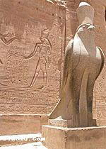 荷露斯神庙修建于公元前237年,历时200多年才竣工完成,主要供奉鹰头人身的天神荷露斯(Horus)。荷露斯是古埃及最重要的神之一,是太阳神Osiris与保护女神Isis的孩子,通常被描述为戴着埃及皇冠的神鹰,古埃及的法老们都视自己为荷露斯的化身。