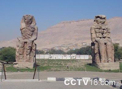 门农巨像是矗立在尼罗河西岸和帝王谷之间原野上的两座岩石巨像。原来是“阿敏何特普(AMENHOTEP)三世”法老神殿前的雕像,但神殿本身已无踪影。巨象高20米,风化严重,面部已不可辨识。坐像是由新王国时代鼎盛期的阿蒙荷太普三世建造的。坐像身后,原来是他的葬祭殿,但后来的法老拆了这座建筑,并把他做为自己的建筑物的石料。到了托勒密王朝时代,建筑物已经完全被破坏了。