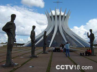 位于巴西利亚的巴西利亚大教堂。这座教堂与传统的欧洲教堂迥然不同。它没有通常的高尖屋顶,16根抛物线状的支柱支撑起教堂的穹顶,支柱间用大块的彩色玻璃相接,远远望去如同皇冠。而教堂主体则坐落在地下,人们通过甬道进出.