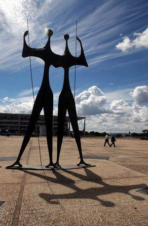 在三权广场,游人看不到任何古迹,但丰姿多彩的现代派建筑物令人惊叹不已,这些建筑设计构思大胆、线条优美、轻盈飘逸,其中有的还含有一定的寓意。两层楼高的总统府前的一尊两人持矛并肩而立的首都开拓者铜像,象征着巴西人民团结一心捍卫祖国。三权广场代表国家三种权力,称为巴西的神经中枢。可给人留下深刻印象。