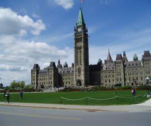 俯瞰渥太华河的一系列铜顶石砌哥德式建筑物,便是国会大厦(Parliament Hill),前面著名的钟楼上飘扬着加拿大国旗。庄严的国庆阅兵式就在蕴含着古老欧洲风格的国会大厦前举行。夏日的清晨,凉风习习,在国会大厦前可以观看到皇家禁卫军的换岗操练仪式。夜晚,国会大厦前的广场上,彻夜不灭的篝火伴随着优美的音乐,给参观者及乘凉者以极大的享受。