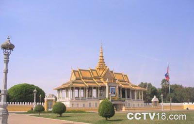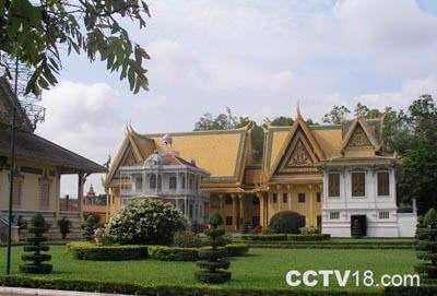 是诺罗敦国王于1866——1870年建造的,坐落在洞里萨河边,也称四臂湾大王宫,有宽敞平整干净的马路和大块的草坪广场,包含国王的住所在内共有20余座建筑。王宫为长方形,长435米,宽402米,外有城墙。王宫的建筑具有高棉传统建筑风格和宗教色彩,宫殿均有尖塔,代表繁荣;殿身涂以黄、白两色,黄色代表佛教,白色代表婆罗门教。王宫最初为木结构,后改建为水泥结构,但保持了原来的风貌。王宫内还有银殿(Silver Pagoda)和拿破仑三世博物馆。