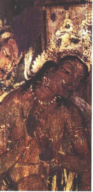 阿旃陀石窟内的壁画大多采用牛粪、大张旗鼓黏土并涂上石灰作底,以加工后的矿物、植物粉末作颜料,层次分明,色彩鲜艳。