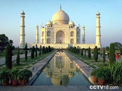 坐落于印度古都阿格拉的泰姬陵,是世界七大奇迹之一,宏伟壮观,以纯白大理石砌建而成。