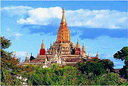 阿难陀塔(Ananda Pahto)塔有40多米高,塔顶尖尖,上面是金色的,在阳光的照耀下异常夺目与端庄,主塔的周围环绕着许多小塔和佛像。塔为圆形,通体贴满黄灿灿的金箔,并镶嵌着无数光彩夺目的珠宝。塔的下部有以佛本生故事为内容的500多幅彩陶浮雕,塔的底座是印度式的四方形大佛窟,四面的拱门内各有一尊近10米高的立佛,塔的四周有众多的小塔、佛像和各种动物怪兽的雕像。