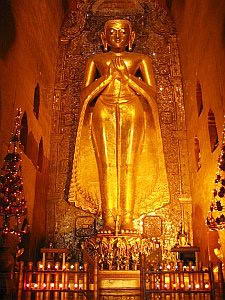 四面拱门内各有一高18英尺独木雕刻的佛像,分别用檀香木、柚木、松木和玉兰木雕成,形态逼真,栩栩如生。其中一尊佛像,当你站在佛像前仰视时,佛像面容庄重;但后退20米处再看时,佛像开始微笑起来,面容慈祥可亲。佛塔内外的墙壁上有数不清的精美壁画、浮雕和佛像,阿难陀佛塔,造型新颖,比例适中,采光和通风良好,兼之拥有大量的雕刻和壁画,实为缅甸佛塔之佼佼者。