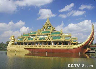 景色秀丽的皇家湖上,有缅甸的最具有特色的建筑皇家鸳鸯船,也称卡拉威宫,白天看去金碧辉煌,夜晚则灯光璀璨,倒影斑斓。湖畔的柚木皇宫酒店极尽缅甸皇家风范,经常是外国政要出没的地方。