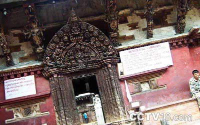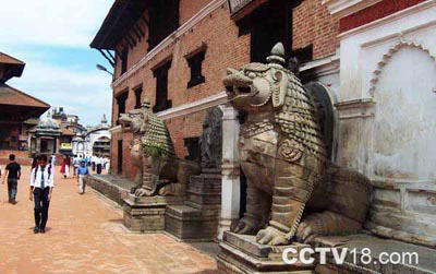 金门是通往55窗宫主院的入口,该门为伦吉特 朱罗国王所建,是全世界这类门中外观最漂亮,雕饰最丰富的门之一,门上所饰神灵和怪兽复杂而精细,55窗宫建于公元1700年,墙壁以砖砌成,上面饰以优美的背景和雕刻图案,还有一个带有55个窗户的阳台,阳台堪称木雕杰作,在王宫广场上还坐落着巴特拉德维石庙,石庙上饰满图案复杂而精细的雕刻,石庙也是尼泊尔希卡拉风格建筑的杰出典范,石庙的露台上有一个巨大的铜钟,亦称吠钟,是公元1737年安装的,当时,人们以钟声来宣布已到灭火熄灯就寝的时刻。