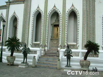 大皇宫规矩严,无袖、膝上短裙、短裤(九分裤也不行,必须是十分)、拖鞋者不得入内。进大皇宫就看见一支穿着着战军服、拿着枪的队伍,个个精神倍爽,正奇怪怎么会有军队,阿伟说那是皇宫保安。那些鲜花草坪与他们形成一种玫瑰与枪炮的组合,刚与柔的相济总是有着悲壮的情怀。