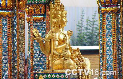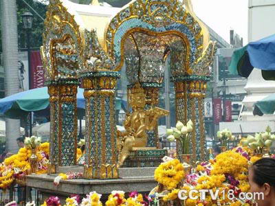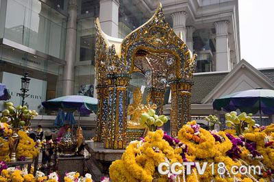 四面佛在泰国被称为有求必应佛,四面佛位于泰国曼谷市中心爱侣湾大酒店面前,四面佛是泰国香火最旺的佛像之一,每天从世界各地前来的朝拜许愿者成群结队,络绎不绝。四面佛所处的位置,四面佛是曼谷的是中心热闹地带,著名的曼谷世界贸易中心大厦斜对面。周围是高楼大厦,马路上是塞的密密麻麻的车辆,人行道上的游人擦肩接踵,一幅现代大都市的写照。但在车水马龙的噪杂声中,传来一阵阵的泰国古典音乐,马路旁四面佛神像前的空地上,几对古装打扮的少女正随着曼妙的音乐声翩翩起舞。