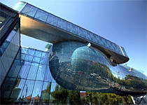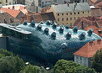 穆尔河畔的现代美术馆/新艺术中心(Kunsthaus Graz)为英国建筑师彼得库克(Peter Cook)的作品,以蓝色的塑料玻璃拼贴而成,当地人亲切地称之为“友善的外星人”(a friendly alien)。座落在格拉茨市中心的超现实主义建筑与红顶尖塔的古堡、钟楼所形成的强烈反差是格拉茨最经典的标志景观。