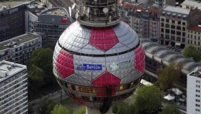 柏林电视塔高365米,在全国首屈一指,比巴黎的艾菲尔铁塔还高出45米。远远望去,电视塔像一只倒竖的巨型喇叭,底部粗,上端细,在两百多米的高空有一个球型建筑物,内设餐厅和观光厅。塔底层的圆厅内装有两部高速电梯,瞬息之间能把游客送到半空中的观光厅。