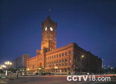市政厅门前蓑着黑熊城徽(即州徽)。100米高的钟塔是柏林居民明确的路标。钟塔尖上高高飘扬着州旗,旗的上下方各0有一道红边,中间为白底黑熊。熊是柏林的象征性动物,据传说柏林这个地名就是由德语“小熊”演化而来的。