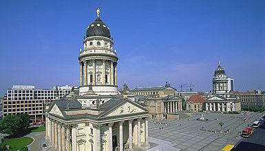 1780年到1785年卡尔·封·根塔德设计的两座尖顶教堂,采用了德意志大教堂和法兰西大教堂的名字。法兰西大教堂是胡格诺派教会的教堂,里面现有一座博物馆(星期三~星期六12:00~17:00,星期日13:00~17:00,门票2马克)教堂大钟每天12点、16点、19点整敲响,在德意志大教堂里有长年开放的展览,在那里可以找到“关于德国历史的问题”的答案.