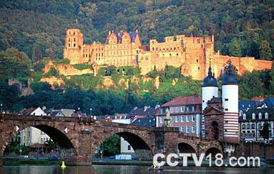 走出地窖,来到古堡前的大阳台,海德堡下的旧城区尽收眼底, 内卡河河静静地流着,像是诉说着过往的历史, 阳光挥洒在古桥之上,幽雅的景致,也不禁令人引发思古之幽情, 享受这一刻的美丽;置身在如此的美景之中,真希望时光能暂时停留,徜佯在这般的人间胜境; 让人忍不住要赞叹这些曾经为这块土地耕耘流汗过的古圣先贤、文学家、建筑、雕刻、美学等艺术大师。