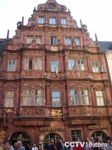在市集广场与圣灵大教堂相对的是骑士之家Hauz Zum Ritter,骑士之家又称圣乔治骑士之屋Hauz Zum Ritter St. Georg﹞,年龄比古桥老一倍,始建于一五九二年的文艺复兴后期,算起来也有四百年的历史,是海德堡内经1693年法国人因王位继承权所引发的战争期间极少数未被破坏的漂亮建筑,原为民宅,后改建为大饭店。