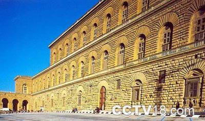 皮蒂宫是佛罗伦萨最宏伟的建筑之—,原为梅迪奇家族的住家。建于1487年,可能是布鲁奈莱斯基设计的。16世纪由阿马纳蒂扩建。正面长205米,高36米,砌以巨大的粗制石块。唯一的装饰是底层窗户支架之间的狮头雕像。向前凸出的两翼工程建于洛林时期。从拱形大门穿过中庭就进入阿马纳蒂庭院,庭院的后身是高于它的博博利山丘。山丘与园林组成这座建筑的后身屏障。二楼是王室住宅和帕拉蒂娜画廊(GalleriaPalatina),三楼是现代艺术馆,这座建筑还是银器博物馆和马车博物馆。