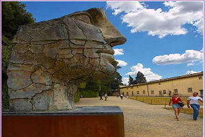 波波里庭园很大,依山而建,很多地方林木高耸像未着人迹的原始森林;不多的几处人工也都很精彩,比如起伏的长长的林荫道,颇有现代风格的头像拼贴雕塑,还有吓人的白眼吐舌怪兽喷泉等等。从蔷薇园望出去、点缀着富有层次的Tuscany式小房子和柏树林的小山,仿佛总是湿漉漉的样子,另类田园的感觉.