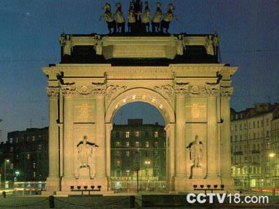 莫斯科凯旋门与法国巴黎的凯旋门不相上下。因为是纪念同一场战争而修建的,是为纪念俄军打败拿破仑而建。门高28米,门顶是一尊手执月桂花环,背生双翅驱驾六套马车的胜利女神像。其下武士,手执利剑,或月桂花环和橄榄枝,象征胜利和平。门柱之间,四尊俄军士兵,身披盔甲,手执盾枪,手指上刻着“驱逐法兰西,解放莫斯科”,整个造型气势宏伟。