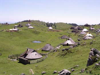 斯洛文尼亚位于阿尔卑斯山脉东部,这里有一个叫Velika Planina(意思是“大山”)的地方,占地557公顷,是斯洛文尼亚最大的高山牧场。从卡姆尼克溪谷乘坐缆车,飞越温带阔叶林和寒带针叶林,只需十几分钟便可到达海拔1550米的牧场。这里以雄峻的格林托维茨峰为背景,青松环绕,天高地阔,冬季是滑雪爱好者的天堂,春夏则是登山健行者的乐土。这里保存着欧洲最古老的牧人村落,一百多座造型奇特的木屋在牧场上星罗棋布。