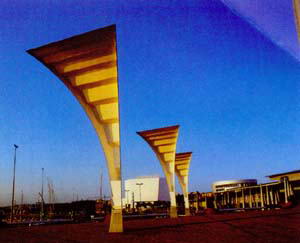 码头宽阔整洁,大道两旁到处是棕榈树、草坪绿地、现代风格的路灯和雕塑装饰。这里聚集了港口区最吸引游客和当地人的三大建筑集商业、娱乐、餐饮于一身的MaremagrlLim大楼、IMAX电影馆(采用Imax,Omnimax和三维制式放映全景电影、立体电影)和欧洲最大的水族馆L Aquarium。在西班牙码头上还有皇家海上俱乐部和航海俱乐部,可以看到上百艘游艇停泊在港中的壮观景象。最具标志性的当属一座名为“海上兰布拉”的新建木制吊桥,桥身呈波浪起伏的“S”状,桥上立着一段段顶部带曲线的栏杆,远观好像一条条鱼穿行于海中,设计十分巧妙。取名为海上的兰布拉大街,自然显示出它在海港区的重要作用。“海上兰布拉”连接着老港的木材码头(Moll de Ia Fusta)和西班牙码头(Moll d Espanya)。木材码头是老港最先被改造的区域之一,目前己成为一条铺设着方石,并栽种着棕榈树的美丽大道,在道路的旁边建有一排排现代风格的餐厅和酒吧。