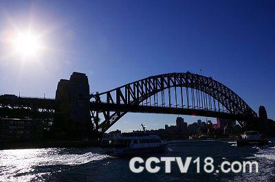 无论乘飞机还是乘海轮到达悉尼,最先映入眼帘的就是这座全世界最宽的大铁桥。在斜阳的金晖中,拱桥映衬着变幻的夕阳,由金黄而姹紫,由姹紫而暗褐,海面上的桥影刚刚褪淡,立刻有闪亮起斑斓的光带。大桥钢架、栏杆上的璀璨的千万盏灯光,远望恍惚是在弓背和弓弦上镶嵌的无数钻石,在黑丝绒般的夜空下,仪态万千;再衬上波平如镜的海湾中五颜六色的霓虹灯倒影,平添几分神秘。桥上往来的车辆就像是一排排整队爬行的蚂蚁,十分壮观。每到晚上,只见桥的钢架和栏杆上,都亮起了电灯,这些灯在深黑的夜空下,在神秘的海湾中像星星一样眨着眼.澳大利亚人形容悉尼海港大桥的造型像一个"老式的大衣架",并把它誉为悉尼的象征。由于悉尼海港大桥和悉尼歌剧院相邻,人们将歌剧院和大桥联成一体欣赏时,雄伟和婀娜、深色和浅色、直线和曲线构成了一副反差强烈又协调一体的美丽图画,真是相映成辉。