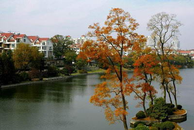 琥珀潭犹如一块天然的琥珀,玲珑剔透,流光溢彩。“水是眼波山是眉”,秋日的琥珀潭,一泓清绿,安静地呆在喧闹的城市里,在阳光的照射下呈现出斑斓的色彩,摇曳潋滟,就像一块天上的极品琥珀不慎落入了凡间。当晨曦初露时,圆圆的太阳挂在林子的树梢上,没有耀眼的光芒,颜色也不是那么红,有一层黄色的晕,给人一种很柔和的感觉。潭的东边连着环城路,茂密的树林里栖息着许多鸟儿,最多是灰喜鹊,每天清晨,俊俏的鸟儿在林中婉转啼鸣,跳跃嬉戏;远远地望去,杏花公园里的摩天轮竟然在林子的上边画了半个圈;沿着潭边是一溜垂杨柳,总是一片风拂杨柳情依依的样子。