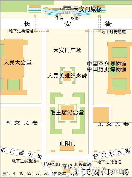 天安门广场是北京的心脏地带,世界上最大的广场。广场北面的天安门原是明清两代皇城的正门,始建于明永乐十五年,最初叫"承天门",寓意奉天承运,受命于天。清顺治八年改建,并更名为天安门,天安门高33.7米,下面的城台建在1.59米的须弥座上。城台共高14.6米。城台是重檐歇山顶城楼,宽9楹,进深5间。9、5二数象征至尊。城楼上60根巨柱高耸,金砖铺地,南北两面菱花格扇门,天花门拱和梁枋上绘满中国传统吉祥图案和金龙彩绘,城楼正面有五个拱形门洞,中间的门洞仅供皇上出入。天安门是明清两代皇上颁诏之地。遇有新皇登基,大婚,祭天祭地等重大庆典活动和皇上父母进宫才会启用,另外皇上御驾亲征或大将出征,都要在天安门前祭路,祭旗,以求马到成功,凯旋归来。城楼前有外金水河,河上飞架7座汉白玉雕栏石桥,中间一座最宽阔的称"御路桥",专为皇帝而设;"御路桥"两侧有宗室亲王过往的"王公桥";"王公桥"左右的"品级桥"是供三品以上官员行走的;四品以下的官员和兵仡,夫役只能走"公生桥"。公生桥架在太庙也就是今天的劳动人民文化宫和社稷坛也就是今天的中山公园门前。解放后共经历过四次修缮。开放时间是从早上8:00至下午的17:00,票价15元。
