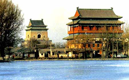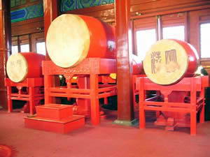 鼓楼在地安门外大街。民永乐18年(1420年)福建,清嘉庆五年(1800年)和重修。下为高约四米的城台,台前后各有券门三道,左右各一道。楼面阔五间,重檐重楼歇山顶。鼓楼是明清两代击鼓报时之场所。1924年一度改为"明耻楼",陈列展出八国联军入侵北京时有关国耻的实物,现存楼上的一面更鼓上有刀痕,既为八国联军所砍。