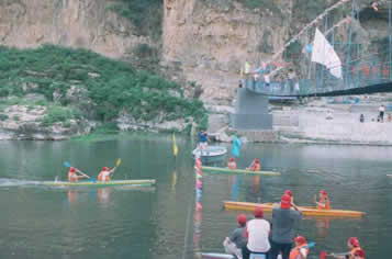 “一桥飞架南北,天堑变通途”,一座铁索桥横跨拒马河,铁索桥入口处百米码头与天然石舫遥相呼应。两岸绿树葱郁,金沙泛光,山湖一色,青年男女泳装斑烂,嬉戏于水面或追逐于沙滩上;游船荡漾,竹排片片,对对情侣飘流在碧波上或漫游于绿荫之间。置身其中,令您陶醉,流连忘返。当您进入岸边的峡谷,只见溪泉争淌,水石相叠,峭壁两侧,植被丰茂,绿透崖壁,一个形似瓶状的泻泉池水清可见底,映入眼帘的便是嫦娥洗浴潭。青峰壁立,群山逶迤,山光水色,变化多姿,步移景换,山路愈险,突然在谷口拐角处,巨石耸立,状如青蛙,名为“蛙引路”,进入“清凉谷”,顿觉温湿清凉,谷内露雾沼沼,峭壁苍翠,远处雾山影随,袭袭凉意尽侵肌肤,盛夏之际,倍爽怡人。“回音壁”乃一奇形峭壁,高声呐喊,回声荡漾,丝丝入耳,回旋谷底。
