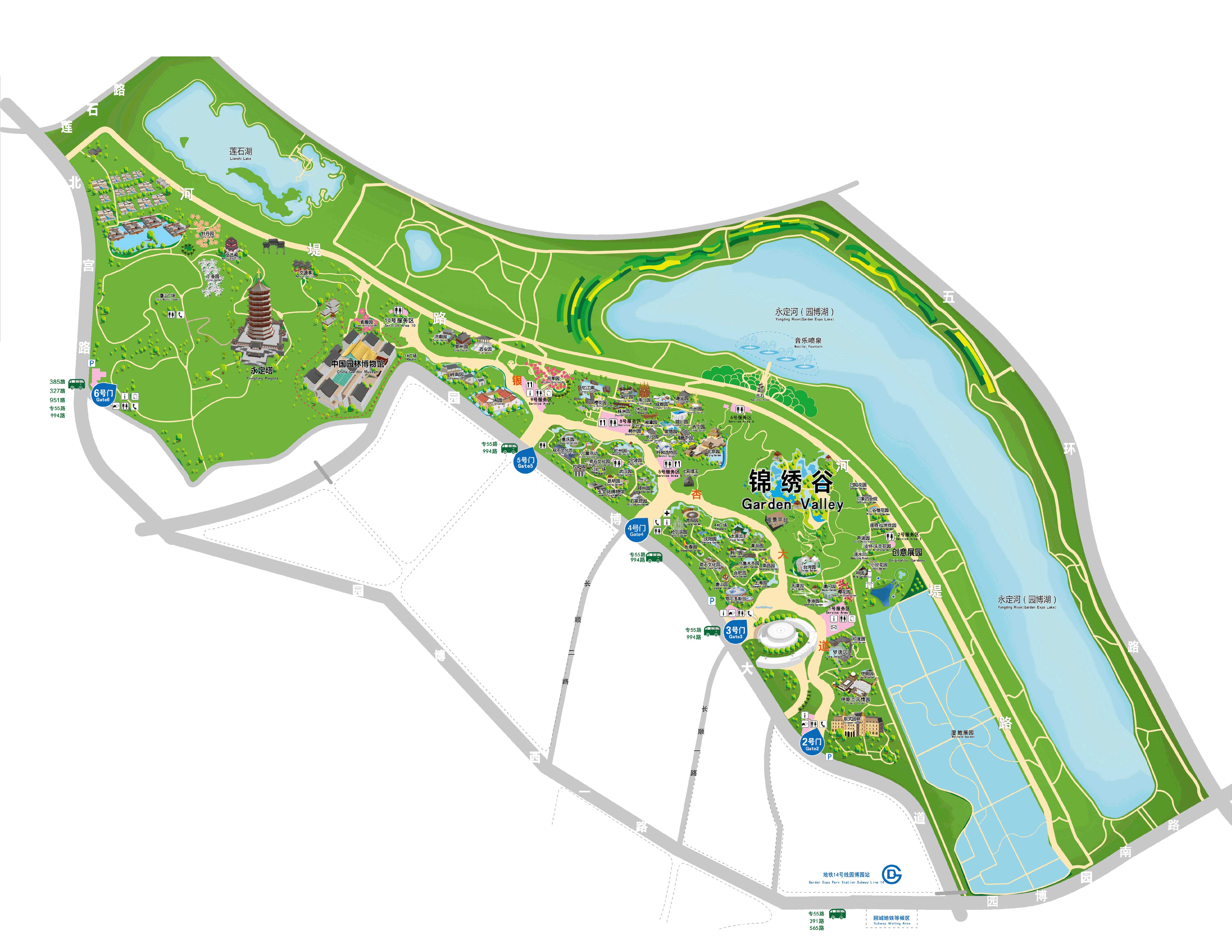 园区规划布局为“一轴、两点、五园”,“一轴”即园博轴,是贯穿主展区的景观轴线。“两点”即永定塔和锦绣谷。永定塔为辽金风格的仿古塔,高69.7米,是园博园的标志性建筑;锦绣谷是园博园“化腐朽为神奇”的典范,将一个20多公顷的建筑垃圾填埋坑打造成了花团锦簇的下沉式花谷。“五园”即传统展园、现代展园、创意展园、国际展园和湿地展园,共有展园69个。