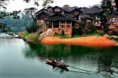 古镇商铺建筑最具代表性,依山势形成的商街纵向长1000多米,层层递进,其风雨场的过街建筑几乎都是能遮风避雨不见天日的“封闭式”建筑,由此设计,充分考虑到了川东地区雨晴不定的特点。建筑多为两层“吊脚楼”,下层为铺面,楼上可住人,铺面开间做得较大,且易组合;整座古镇全系青色瓦片盖顶,红漆木板竹篾夹墙,圆柱承重,古朴凝重中透出原汁原味的巴渝人家风韵。