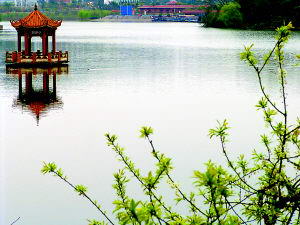 音乐广场:海兰湖畔,青水相依,湖水相伴;古朴长廊,杉木桌椅,相映成趣。