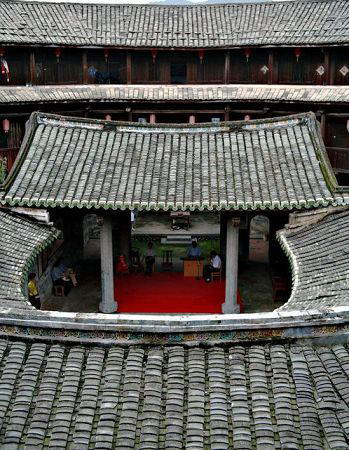 桥下不远处,深潭碧水,古榕葱茏,如伞如盖。如果站在大门对岸的村道上回望振福楼,可见振福楼的屋面正好位于峡谷两侧的山峦之间,楼不高不矮,不显不隐,正好起到两山之间"过渡"的作用。可以说,以振福楼为中心形成的秀美而幽静的山水田园环境,是天地人溶成一体的杰作8集电视连续剧《土楼人家》的片头,就选取了这片风景为主体画面。