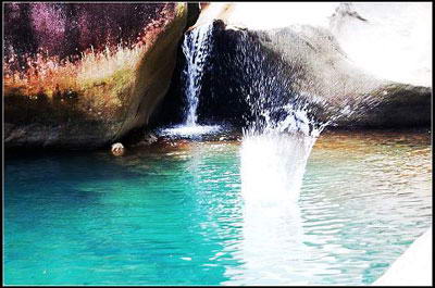 峡谷深处是一处宏伟壮观的瀑布群,瀑布源头海拔高480多米,宽30多米,分三层瀑布,每个瀑布下有一个100M2以上的绿潭,游者可涉险攀至二瀑下,潜入潭中,尽享水中乐趣。整个瀑布群一瀑为100多米,二瀑80多米,三瀑60多米,水量大时,其声如雷,十里可闻,且瀑区经年雾蒸云腾,七彩长虹,凌空南北,非常壮观。