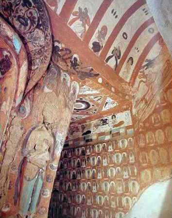 西千佛洞是敦煌艺术的重要组成部分,虽然洞窟重修的情况比较普遍,但还是保留下了一部分或大部分原窟。以西魏第9窟为例,北周、隋、唐、回鹘乃至清代都进行了局部重修,但在中心柱和四壁仍有不少西魏原作。塔柱东向面龛楣上的说法图造型精致、色彩清爽、意境高雅,并有武则天如意元年(692年)的题记。北壁回鹘时期所绘涅槃变亦是这一时期的代表作。