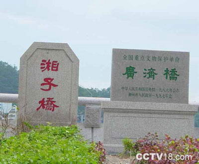 这座充满神奇的大桥,每一个桥墩距今都有几百年的历史,从宋代建成第一个桥墩到形成“十八梭船二十四洲”的格局,前后共延续了300多年。在古代生产力落后的情况下,在大江上建造这样的大桥,其难度是超乎人们想象的,故潮州民间便流传许多“仙佛造桥”的传说。据说,韩愈刺潮后,时常登东山门(即今笔架山)游玩。但深感过江之苦,便请他的侄孙韩湘子和广济和尚一起造桥。韩湘子造东面一段桥,请八仙来帮忙。韩湘子亲自去凤凰山取石,把石头都变成黑猪,一路赶来,但最后一群猪刚赶到凤南时,给一个孕妇识破,怪叫起来:石头怎会走路!一句话泄破了天机,石头再也赶不动了,因此韩湘子负责的那东面最后几墩没有修起来。广济和尚造西南一段桥,也请来十八罗汉帮忙。他亲自去桑浦山开取石头,把石头点化成群乌羊,一路赶来。但当最后一群鸟羊赶到半路时,碰到当地一个恶霸地主,存心想夺取这些羊,便说:“你这和尚哪来的羊呀!分明是我家的。”广济和尚被纠缠得不耐烦,便说:“既然是你家的羊,便赶到你田里去吧!"地主把羊一齐赶到他自己的田里去,却变成一座座乌石山,把地主的良田压掉了。相传这就是浮洋乌洋山的由来。因此,最后一批黑猪,乌羊没有及时赶来,中间一段桥便没法修拢。怎么办?天又快亮了。八仙中何仙姑只好将手中的莲花瓣抛向江心 化成十八条梭船;广济和尚一见,立即抛下禅杖,化成一根大藤,把十八只大船拴住,成为浮桥。这样,人们为纪念仙佛合力造桥的功绩,便把此桥既称为“湘子桥”,又叫“广济桥”。