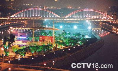 每当红日高照,双桥倒影,仿如两道长虹。入夜,华灯璀璨,双桥上下灯光盏盏,有若串串明珠; 两河碧水,波光粼粼,仿如双龙戏水。两堤四岸,红灯高挂,绿柳低垂; 广场里外,霓虹四射,把双桥中间的南城文化广场映照得斑斓夺目,气象万千。广场北部篮球场、足球场、网球场一字排开,撩人遐想宏远男篮 CBA 夺冠之雄姿,南城足球队驰骋绿茵之身影。中部文化活动区,无遮盖式的中心舞台时有演出,或长袖轻纱,轻盈袅娜;或豪放粗犷,热情奔放,广场内群众轻歌曼舞,韵律操矫健优美,集体舞节奏明快,尽显南城儿女之时代风姿。桥上车水马龙,广场上蹁跹舞影。灯光、舞影、绿树、清流尽入画图中。