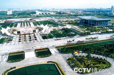 建筑等有机地联系起来。广场区位于地段的中部和南部,中部是中心广场区,两侧为休息绿地,再外侧为带柱廊的观光廊。南部是滨水广场,背靠弧形空廊面向水轴空间开敝,空间通透畅朗。