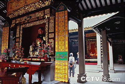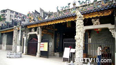 头门面阔3间,进深3间9架,两山墙乘重,梁、枋、驼峰、雀替均做成木雕的工艺构件,雕刻麒麟等吉祥纹饰,遍施金彩,连檐板雕刻更是精细,吉样纹,戏曲人物雕刻得生动传神;墀头上的砖雕花纹,从残存的纹样上看,也是精雕细刻,独具匠心。顶为5山风火山墙,上盖碌灰筒,蓝琉璃瓦剪边。正脊是石湾文如璧造的陶塑人物瓦脊,上有“同治丁卯”(同治六年即公元1867年)字样。
