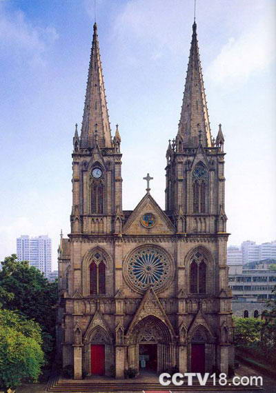 教堂建筑总面积为2754平方米,东西宽35米,南北长78.69米,由地面到塔尖高58.5米。教堂属“哥特”式建筑,可与闻名世界的法国巴黎圣母院相媲美。1863年6月28日是天主教圣心瞻礼日,正式举行奠基典礼,并命名为圣心大教堂。
