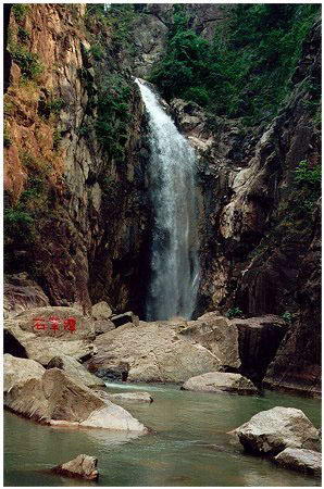 石笔前面,左右两面山势紧迫,有小石潭(前潭)阻住去路,深可没人。靠左边走手攀山边石,脚踏潭底石,摸索以渡;涉水几步,即登对岸。转入石笔后,别有一洞天:十几丈长、四五丈宽的谷地,到处巨石夹清流; 左右两边,几十丈高山壁立;正面山凹,一条瀑布漂下潭——它就是后潭。后潭潭水甚清,也看不见底;几丈瀑布漂下,也激不起巨浪。身临潭边,如雨的水珠满头,如雷的水声满耳;寒气迫人,不能久留。有台蛮公路直达,交通方便,是台山市著名的旅游景点,每“清明节”、“重阳节”游人特别多。