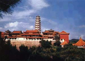 如今,在千佛塔下,又新建了雄伟的千佛殿,殿中有各样栩栩如生的神像,中间毗卢庶那大佛像镶嵌着两万颗宝石,为中国之最。大殿两侧的二十车诸天壁画,全国仅有两幅,另一幅在北京。千佛殿下还有沿山而上的九曲文化游廊,古建筑与现代化艺术融为一体,显得更加灿烂辉煌。