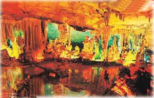 白石岩 白石岩与双龙洞隔山相对,洞口离地面30多米,气势不凡。洞穴总面积2000多平方米,高20~30多米,布局奥妙,层次分明,回廊洞室,高台深院,错落有致,钟乳石迎面而来,步移景换,姿态万干,在彩灯的照射下,如真如幻:佛殿皇宫,高阁飞椿,雕梁画栋;仙山御苑,奇花异木,雾遮烟笼;洞顶长空,鹤游凤舞,云海卧龙。景观70多处,即有豪放明快之作,又有透剔玲珑之品,主要有“昭君出塞”、“江南春色”、“广寒宫”、“凌云宝塔”、“仙女思凡”、“八仙贺寿”、“元宵灯会“水漫金山寺”、“瑶池仙境”等。其中“瑶池仙境”更是皇皇大观,条条石笋姿态万千,在灯光映照下晶莹通透,兼有一池泉水,景物倒映生辉,令人叹为观止。原广东省政协主席吴南生为该洞题写了洞名。