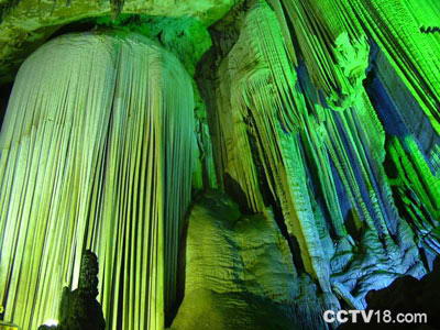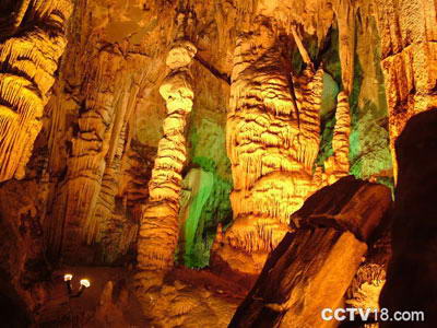 它由石英岩和石灰岩组成,内有10多个天然大厅和2个支洞,总长约1.4公里,平均高度4米,最宽处20多米,最窄处约1米,洞内迂回曲折,起伏有致,石笋、石幔、石柱、石钟乳密布其中,有“金鸡独立”、“天马行空”、“神龟出洞”、等几十处景点。