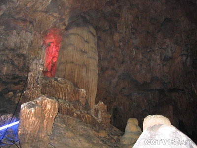 穿过石巷曲径,便到了观音殿。只见一座白色石笋,如一座盛开的荷花,花中坐着慈目低垂的“观音”菩萨。观音旁边那座石笋象是抱着孩子的送子娘娘。周围无数的小乳石就象一群群前来朝拜的仙人。其中一尊如太白金星在拱手相迎。所有这些形象生动地构成了一个“紫竹松林”的境界。在观音殿对面是蓬莱仙岛的奇异景观,蓬莱是传说中的海上仙山,它奇特之处在于海上出现的海市蜃楼景象。这里的景色海天茫茫,空照澄碧,远方的海市隐约可见,那红色呈拱状的地方象是一座城门,里面各式建筑星罗棋布,景象万千。