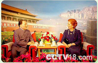 1、世纪创举———“看伟人不动声色的世纪交锋,观百年风云挥洒于谈笑之间。”以天安门广场和香港岛中环的大型电脑喷画为背景,邓小平与撒切尔夫人亲切交谈的仿真蜡像造型,表现出世纪伟人运筹帷幄、把握重大历史转折的雄才伟略的气度风范。