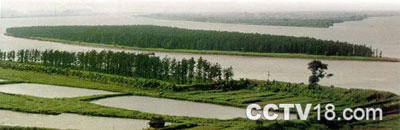 这是一片在冲积沙岛上生长的,由清一色水松树组成的原始森林,隔水远眺,只见绿葱葱一大片,水天相连,令人叹为观止。
