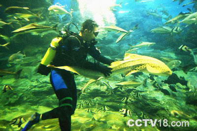 第二个要给您参观的是海底隧道,头顶着一片片蔚蓝的海水,脚踏着深深的海床,仿佛把整个海洋搬到了游客们的身边。透过压克力身外是大海,有美丽的珊瑚礁、有战争年代被击沉的军舰、忽儿有一大群鱼儿匆匆游过,鳗鱼钻在沉没的古城废墟中耐心等待着猎物靠近,如果您细心的观察,还能找到渔民洗碗时不小心掉进海里的碗盘。如果您有时间多驻足,一定会发现潜水员忙着打捞沉物、清洁海洋。当您看到他们这样辛劳的工作时,相信您会和我们一样去努力保护海洋环境,共同去维护好我们美丽的大海。