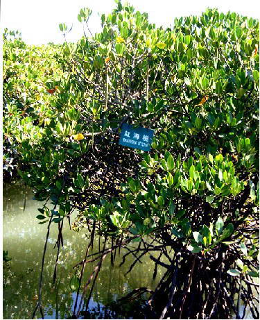 退潮后的英罗港,由红海榄树组成的原始森林,树高8米,树冠茂密,盘根连冠,交错成片,蔚为壮观。涨潮时,树冠隐于海水之中,人们可海上泛舟绿叶梢头,群鹤惊起,别有情趣。是一处新游览景区。